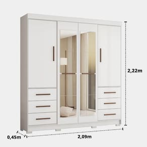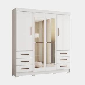 O Guarda Roupa 4 portas Estrela possui uma excelente divisão interna, com colméia central. Este "roupeirão" é robusto, produzido 100% em MDP, possui 6 gavetas com corrediças metálicas, puxadores em MDF, cabideiros em alumínio. Para completar, o Guarda Roupa Estrela conta com espelhos super úteis e que dão um toque ainda mais bonito ao móvel. Acabamento da Prateleira: Pintura Escala de Brilho da Prateleira: Fosco Possui Cabideiros: 02 Acabamento da Gaveta: Pintura Material do Puxador da Gaveta: MDF Possui Organizador de Gaveta: Não Acabamento da Porta: Pintura Escala de Brilho da Porta: Fosco Altura do Espelho: 39,5 cm Altura dos Pés: 5 cm Ambiente Principal: Quarto Complexidade da Montagem: Média: pode ser montado por mais de uma pessoa e/ou necessite de maior conhecimento para montagem Cor: Branco Cor do Produto: Branco Escala de Brilho: Brilhante Espessura do Espelho: 3 mm Fita Integrada: Sim Formato do Espelho: Retangular Gaveta com Chave: Não Itens Inclusos: 1 Guarda Roupa, Kit Ferragens e Manual de Montagem Largura do Espelho: 32,8 cm Manual de Montagem e Instalação: https://cdn2.madeiramadeira.com.br/atributo/mapi-moveis/560028-manual-roupeiro-estrela-1166.pdf Material da Gaveta: MDP Material da Porta: MDP Material da Prateleira: MDP Material dos Pés: ABS Material Principal: MDP Necessita Montagem: Sim Origem do Produto: Nacional Peso: 146,2 kg Peso Máximo por Gaveta: 5 kg Peso Máximo por Prateleira: 5 kg Possui Calceiros: Não Possui Espelho: Sim Possui Pés: 08 Possui Portas: 04 Possui Prateleiras: 08 Quantidade de Espelho: 08 Espelhos com Tamanhos Iguais Recomendações de Uso, Manutenção e Limpeza: Limpar com flanela ou pano macio seco, não utilizar produtos abrasivos, desengordurantes, álcool ou qualquer outro produto químico. Não expor o produto diretamente à luz solar e à umidade. Sapatas Niveladoras: Não Sistema de Montagem: Parafusos, porca cilindricas, cavilhas e pregos Tamanho: Tipo de Corrediça da Gaveta: Metálica Simples Tipo de Dobradiça/Corrediça da Porta: Alumínio Tipo de Fixação do Espelho: Fita Dupla Face Tipo de Gaveta: Externa Tipo de Guarda-Roupa: Casal Tipo de Puxador da Gaveta: Externo Tipo de Puxador da Porta: Externo