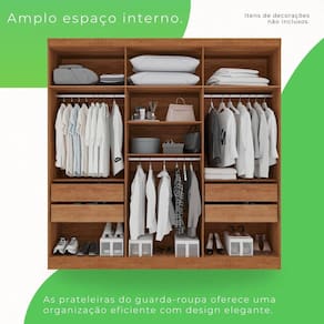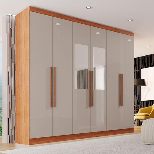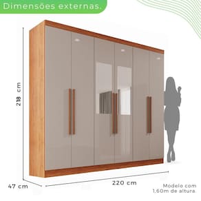O Guarda Roupa Casal 6 Portas 4 Gavetas Coliseu tem um design elegante e moderno, perfeito para seu quarto. Com interior espaçoso, este roupeiro conta com quatro gavetas de corrediças telescópicas, sete prateleiras e três cabideiros para uma boa organização. Produzido com materiais de ótima qualidade unindo funcionalidade e beleza, ele conta com divisão ele e ela e sapateira embutida. Para garantir uma maior sustentação temos um suporte embutido reforçando a gaveta. Um excelente móvel para completar o seu quarto. Acabamento da Prateleira: Pintura UV Escala de Brilho da Prateleira: Fosco Possui Cabideiros: 03 Acabamento da Gaveta: Pintura UV Material do Puxador da Gaveta: MDF Possui Organizador de Gaveta: Não Acabamento da Porta: Pintura UV Escala de Brilho da Porta: Semi-Brilho Material do Puxador da Porta: MDF Altura do Espelho: 70 Ambiente Principal: Quarto Complexidade da Montagem: Alta: deve ser montado por um montador especializado Cor: Cinamomo/Off-White Cor do Produto: Cinamomo/Off-White Escala de Brilho: Semi-Brilho Espessura do Espelho: 3 Formato do Espelho: Retangular Gaveta com Chave: Não Itens Inclusos: 1 Guarda Roupa, kit ferragens e manual de montagem Largura do Espelho: 20 Linha ou Coleção: Coliseu Manual de Montagem e Instalação: https://cdn2.madeiramadeira.com.br/atributo/salleto/1726996-roupeiro-coliseu-6-portas.pdf Material da Gaveta: MDP Material da Porta: MDP Material da Prateleira: MDP Material Principal: MDP modular: Não Necessita Montagem: Sim Origem do Produto: Nacional Peso: 129.7 Peso Máximo por Gaveta: 5 Peso Máximo por Prateleira: 3 Possui Calceiros: Não Possui Espelho: Sim Possui Pés: Não Possui Portas: Sim Possui Prateleiras: Sim Quantidade de Espelho: 02 Espelhos com Tamanhos Iguais Quantidade de Gavetas: 04 Gavetas Quantidade de Prateleiras: 07 Prateleiras Recomendações de Uso, Manutenção e Limpeza: Pano levemente umedecido e pano seco. Não utilizar produtos de limpeza abrasivos. Sistema de Montagem: Parafusos, Cavilhas, Dobradiças e Puxadores. Tipo de Corrediça da Gaveta: Metálica Telescópica Tipo de Dobradiça/Corrediça da Porta: Metálica Tipo de Fixação do Espelho: Parafusos Tipo de Gaveta: Interna Tipo de Guarda-Roupa: Casal Tipo de Puxador da Gaveta: Não Possui Tipo de Puxador da Porta: Externo