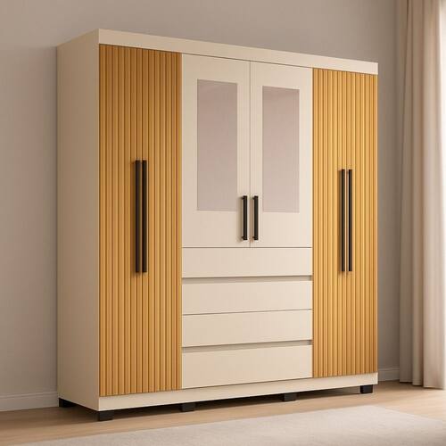 Características: Material em MDP 6 Portas 4 Gavetas Cabideiro metálico Corrediças metálicas Espelho Prateleira Pés 9 Nichos Prateleira suporta até 3Kg Pintura em 3D ripada