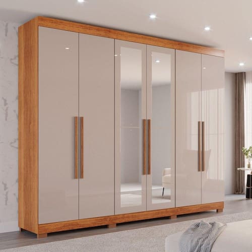 Organize e encontre com mais facilidade suas roupas preferidas, este atraente guarda-roupa Órion Premium com Espelho é confeccionado com materiais de qualidade e resistência, 100% MDF, diferenciado pela sua funcionalidade e beleza, ele é a melhor opção para deixar seu dormitório mais arrumado e convidativo, além de deixar organizado do seu jeito. Com corrediças telescópicas que permitem uma abertura total das gavetas, cores modernas, parte interna espaçosa, divisão ele e ela com prateleiras internas amplas quem oferecem praticidade e organização, contando também com sapateira embutida. Aproveite!! Acabamento da Prateleira: Pintura UV Escala de Brilho da Prateleira: Fosco Possui Cabideiros: 02 Acabamento da Gaveta: Pintura UV Possui Organizador de Gaveta: Não Acabamento da Porta: Pintura UV Escala de Brilho da Porta: Semi-Brilho Material do Puxador da Porta: MDF Altura do Espelho: 100 Altura dos Pés: 5 Ambiente Principal: Quarto Complexidade da Montagem: Alta: deve ser montado por um montador especializado Cor: Cinamomo/Off-White Cor do Produto: Cinamomo/Off-White Escala de Brilho: Semi-Brilho Espessura do Espelho: 3 Formato do Espelho: Retangular Gaveta com Chave: Não Itens Inclusos: 1 Guarda Roupa, kit ferragens e manual de montagem Largura do Espelho: 30 Linha ou Coleção: Órion Premium Manual de Montagem e Instalação: https://cdn2.madeiramadeira.com.br/atributo/salleto/1719501-roupeiro-orion-6-portas.pdf Material da Gaveta: MDF Material da Porta: MDF Material da Prateleira: MDF Material dos Pés: Polipropileno Material Principal: MDF modular: Não Necessita Montagem: Sim Origem do Produto: Nacional Peso: 228.4 Peso Máximo por Gaveta: 5 Peso Máximo por Prateleira: 3 Possui Calceiros: 01 Possui Espelho: Sim Possui Pés: 08 Possui Portas: Sim Possui Prateleiras: Sim Quantidade de Espelho: 04 Espelhos com Tamanhos Iguais Quantidade de Gavetas: 06 Gavetas Quantidade de Prateleiras: 08 Prateleiras Recomendações de Uso, Manutenção e Limpeza: Pano levemente umedecido e pano seco. Não utilizar produtos de limpeza abrasivos. Sistema de Montagem: Parafusos, Cavilhas, Dobradiças e Puxadores. Tipo de Corrediça da Gaveta: Metálica Telescópica Tipo de Dobradiça/Corrediça da Porta: Metálica Tipo de Fixação do Espelho: Parafusos Tipo de Gaveta: Interna Tipo de Guarda-Roupa: Casal Tipo de Puxador da Gaveta: Externo Tipo de Puxador da Porta: Externo