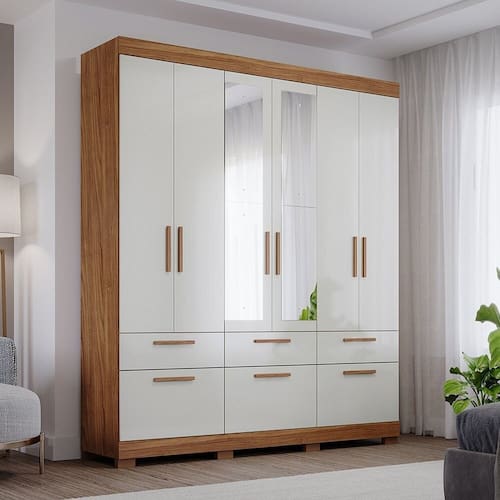 Aproveite para adquirir agora mesmo o seu! Acabamento da Prateleira: Pintura UV Escala de Brilho da Prateleira: Semi-Brilho Possui Cabideiros: Sim Acabamento da Gaveta: Pintura Escala de Brilho da Gaveta: Fosco Material do Puxador da Gaveta: MDF Possui Organizador de Gaveta: Não Acabamento da Porta: Pintura UV Escala de Brilho da Porta: Fosco Material do Puxador da Porta: MDF Acabamento dos Pés: Pintura Altura do Espelho: 65 cm Altura dos Pés: 5 cm Ambiente Principal: Quarto codigo_ean: 7909903691687 Complexidade da Montagem: Média: pode ser montado por mais de uma pessoa e/ou necessite de maior conhecimento para montagem Cor: Cinamomo/Off White Cor do Produto: Cinamomo/Off White Escala de Brilho: Fosco Espessura do Espelho: 3 mm Formato do Espelho: Retangular Gaveta com Chave: Não Informações Complementares: 1 Porta basculante com dobradiça metálica e Cabideiro em Alumínio com suportes metálicos. Itens Inclusos: 1 Guarda Roupa, Kit Ferragens e Manual de Montagem Largura do Espelho: 25 cm Linha ou Coleção: Coimbra Manual de Montagem e Instalação: https://product-hub-prd.madeiramadeira.com.br/909375/documents/97504e9c-c3f3-4ca5-87d3-b3e2837571dd4roupeiroporto6portascopia.pdf Material da Gaveta: MDF Material da Porta: MDF Material da Prateleira: MDF Material dos Pés: ABS Material Principal: MDF modular: Não Montagem Flex: Não Necessita Montagem: Sim Origem do Produto: Nacional Peso: 126,5 kg Peso Máximo por Gaveta: 5 kg Peso Máximo por Prateleira: 10 kg Possui Calceiros: Não Possui Espaço para Vestidos Longos: Não Possui Espelho: Sim Possui Espelho Interno: Não Possui Ganchos: Não Possui Painel de TV: Não Possui Pés: 08 Possui Portas: Sim Possui Prateleiras: Sim Possui Sapateira: Não Produto Montado: Sim Quantidade de Espelho: 04 Espelhos com Tamanhos Iguais Quantidade de Gavetas: 05 Gavetas Quantidade de Prateleiras: 04 Prateleiras Recomendações de Uso, Manutenção e Limpeza: Limpeza com pano levemente umedecido em seguida flanela seca. Não aplicar qualquer produto de limpeza ou cera. Sistema de Montagem: Parafuso, cavilhas e minifix Suporta Até (kg): 90 kg Tipo de Corrediça da Gaveta: Metálica Telescópica Tipo de Dobradiça/Corrediça da Porta: Telescópica Tipo de Fixação do Espelho: Parafusos Tipo de Gaveta: Externa Tipo de Guarda-Roupa: Casal Tipo de Puxador da Gaveta: Externo Tipo de Puxador da Porta: Externo