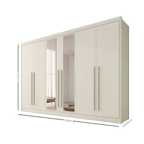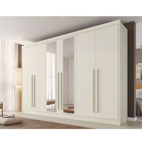 Guarda Roupa Casal com Espelho 6 Portas em MDF Alba Plus Made Marcs O Roupeiro Alba Plus combina praticidade e elegância para transformar seu quarto em um espaço ainda mais organizado. Com 6 portas de abrir, ele oferece amplo acesso aos compartimentos internos, enquanto as 4 gavetas com corrediças telescópicas garantem abertura suave e durabilidade no uso diário. Sua divisão ele e ela proporciona organização inteligente para casais, com espaços bem distribuídos para roupas, calçados e acessórios. Conta ainda com cabideiros e calceiros espaçosos, além de um compartimento exclusivo para calçados, facilitando o dia a dia com tudo ao alcance das mãos.Ideal para quem busca um guarda-roupa funcional, resistente e com visual moderno.