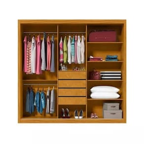 O Roupeiro Royale se destaca pela praticidade das três portas de correr, que contribuem para a otimização de espaço, contando com um amplo espaço interno, onde sua estrutura é formada por quatro gavetas, 4 prateleiras e espaço para vestidos e calças.