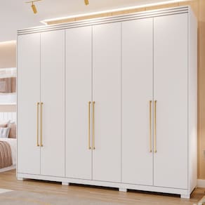 Características: Estrutura 100 em MDF Acabamento Grafiato 6 Portas 5 Gavetas internas Corrediças telescópicas Moldura superior ripada Puxadores em alumínio Dobradiças com amortecimento Espelho interno Cabideiro em alumínio Pés em ABS