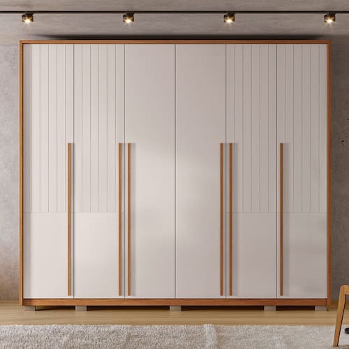 O Roupeiro Suburban Gold, da Espresso Móveis é um móvel de design moderno e funcional, ideal para quem busca por espaço e organização para suas roupas e pertences pessoais. Fabricado em 100% MDF que garante toda resistência e durabilidade, suas dobradiças de 35 mm, cabideiro em alumínio, gavetas amplas com corrediças telescópicas e puxadores em MDF permitirá o bom funcionamento para sua rotina. Os pés e sapatas são opcionais podendo escolher usar durante a montagem. O detalhe do ripado em baixo relevo nas portas dá um toque especial e moderno ao móvel e ao seu quarto. Acabamento da Prateleira: Pintura UV Escala de Brilho da Prateleira: Fosco Possui Cabideiros: Sim Acabamento da Gaveta: Pintura UV Escala de Brilho da Gaveta: Fosco Tipo de Corrediça: Metálica Telescópica Material do Puxador da Gaveta: MDF Possui Organizador de Gaveta: Não Acabamento da Porta: Pintura UV Escala de Brilho da Porta: Fosco Material do Puxador da Porta: MDF Acabamento dos Pés: Laca Altura dos Pés: 5 cm Altura Máxima dos Pés: 5.0000 Ambiente Principal: Quarto codigo_ean: 7909903478066 Complexidade da Montagem: Alta: deve ser montado por um montador especializado Cor: LOURO FREIJO/OFF WHITE Cor do Produto: LOURO FREIJO/OFF WHITE Cor Flex: Não Cor Interna: Freijó Escala de Brilho: Fosco Gaveta com Chave: Não Itens Inclusos: 1 Guarda Roupa, Kit ferragens e Manual de Montagem Linha ou Coleção: Rooms Manual de Especificação Técnica: https://product-hub-prd.madeiramadeira.com.br/875645/documents/b0d17824-028f-4c1f-aa0c-77ace491cd88188ftroupeiroquintus276g6p.pdf Manual de Montagem e Instalação: https://product-hub-prd.madeiramadeira.com.br/875645/documents/8c24555a-e0a2-4e03-b1f4-c77e38ad8c4787eqroupeiroquintusediCAoa.pdf Material da Gaveta: MDF Material da Porta: MDF Material da Prateleira: MDF Material dos Pés: MDF Material Principal: MDF modular: Não Montagem Flex: Não Necessita Montagem: Sim Origem do Produto: Nacional Peso: 221,1 kg Peso Máximo por Gaveta: 4 kg Peso Máximo por Prateleira: 8 kg Possui Calceiros: Não Possui Espaço para Vestidos Longos: Não Possui Espelho: Não Possui Espelho Interno: Não Possui Ganchos: Não Possui iluminação: Não Possui Painel de TV: Não Possui Pés: 10 Possui Portas: Sim Possui Prateleiras: Sim Possui Sapateira: Não Produto Montado: Sim Quantidade de Gavetas: 06 Gavetas Quantidade de Prateleiras: 14 Prateleiras Recomendações de Uso, Manutenção e Limpeza: Limpar com pano macio levemente umedecido e em seguida pano macio seco. Não utilizar produtos abrasivos (lixas, esponjas) e/ou produtos a base de solventes (thinner, aguarrás). Sapatas Niveladoras: Sim Sistema de Montagem: Utiliza-se na montagem do produto sistema de fixação minifix, dobradiças, dispositivos angulares, cavilhas, parafusos, porcas cilindricas, entre outros; Suporta Até (kg): 72 kg Tipo de Corrediça da Gaveta: Metálica Telescópica Tipo de Dobradiça/Corrediça da Porta: Telescópica Tipo de Gaveta: Interna Tipo de Guarda-Roupa: Casal Tipo de Puxador da Gaveta: Embutido Tipo de Puxador da Porta: Externo