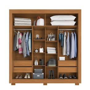 Características 2 Portas de correr MDF 9mm 6 Prateleiras 4 Gavetas internas com corrediças telescópicas Batente vertical em MDP de 25mm Cabideiro metálico Estrutura em MDF/MDP Pés plástico Puxadores de MDF Trilho inferior de alumínio Trilho superior de plástico