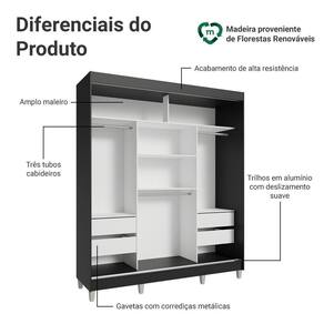 O grande diferencial desta versão está nos pés, que elevam o móvel e facilitam a limpeza do quarto. O acabamento de alta resistência é em preto, transmitindo elegância. Um guarda-roupa versátil, perfeito para transformar o seu quarto em um ambiente mais bonito, organizado e prático.
