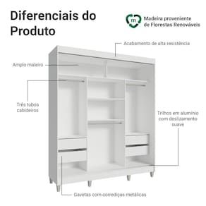 Essa versão possui três portas de correr, sendo duas com espelhos, que trazem mais praticidade no dia a dia. Os trilhos de alumínio garantem deslizamento suave e silencioso, otimizando o espaço do quarto. Por dentro, o guarda-roupa oferece quatro gavetas espaçosas com corrediças metálicas e três cabideiros, proporcionando espaço ideal para roupas, acessórios, malas e outros itens, mantendo tudo sempre organizado.