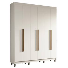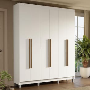 Com acabamento de alta resistência, o Guarda-Roupa Saturno oferece durabilidade por muito mais tempo. A estrutura branca e os puxadores em tom amadeirado Rustic criam um visual sofisticado que se adapta a qualquer estilo de decoração. Os puxadores de 80 cm, fabricados em MDF, são um dos grandes diferenciais, trazendo um design alongado e moderno. Os pés adicionam elegância e facilitam a limpeza, elevando o design do móvel.