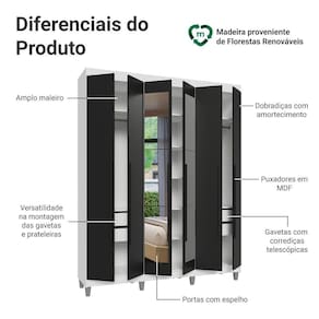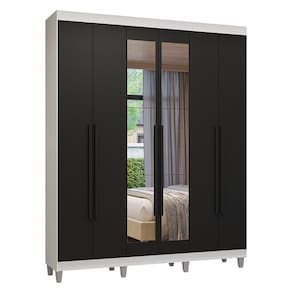 Com acabamento de alta resistência, a estrutura é branca, e as portas e puxadores são pretos, criando um visual moderno e elegante. Os puxadores de 80 cm, fabricados em MDF, trazem um design alongado que valoriza o móvel, enquanto os pés elevam o guarda-roupa, facilitando a limpeza e conferindo ainda mais estilo ao ambiente.