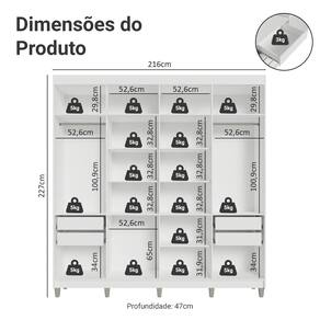 Com amplo espaço para organizar roupas, calçados e acessórios, conta com portas de fechamento suave graças às dobradiças com amortecimento. As gavetas possuem corrediças que permitem abertura total, e o maleiro espaçoso é ideal para itens maiores. Você ainda pode ajustar gavetas e prateleiras para personalizar o interior conforme suas necessidades.