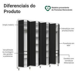 O acabamento de alta resistência é em Branco e as portas e os puxadores pretos criam um visual elegante e moderno. Os puxadores de 80 cm em MDF destacam o design alongado do móvel, e os pés elevam o guarda-roupa, facilitando a limpeza e valorizando o ambiente.