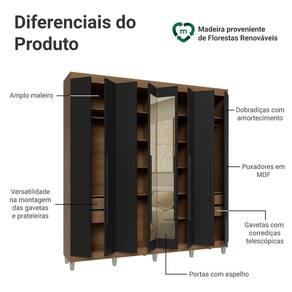 Com amplo espaço para organizar roupas, calçados e acessórios, ele conta com portas de fechamento suave graças às dobradiças com amortecimento. As gavetas possuem corrediças que permitem abertura total, e o maleiro espaçoso é ideal para itens maiores. Você ainda pode ajustar gavetas e prateleiras para personalizar o interior conforme suas necessidades. As portas centrais possuem espelho, agregando ainda mais sofisticação e praticidade ao móvel.