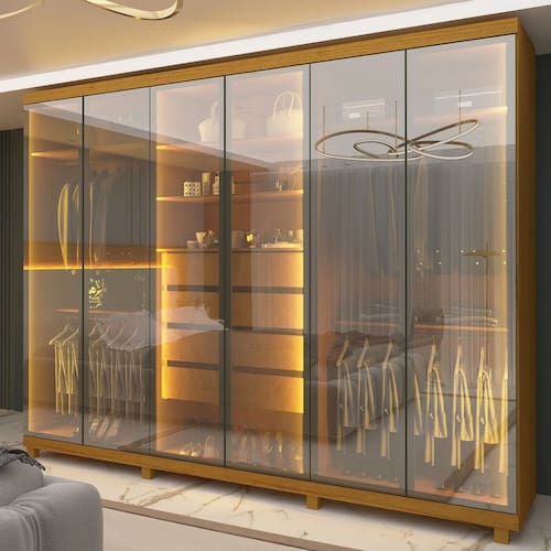 Características: Estrutura em MDF 6 Portas em vidro reflecta Portas com moldura em alumínio 4 Gavetas sendo uma com divisória para joias Corrediças telescópicas Puxadores em alumínio LED em tom quente