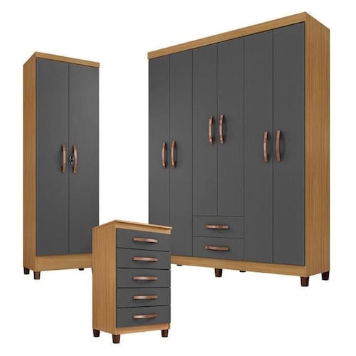 Guarda Roupa Casal e Cômoda Gaveteiro Cannes e Armário Multiuso Egito Carvalho Americano Grafite Incorplac
