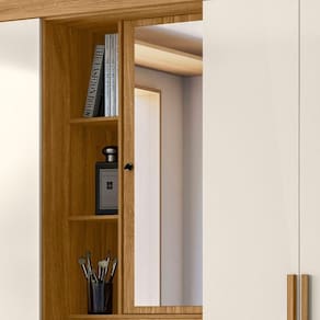 - Painel giratório: De um lado espelho já fixado na peça, do outro porta objetos