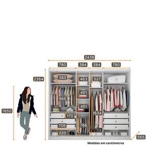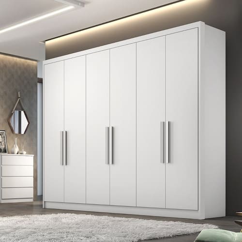 Características: 6 Gavetas internas com corrediças telescópicas e puxadores 2 Maleiros 10 Nichos 6 Portas Cabideiros e calceiro em alumínio Colunado em 25mm Espaço para longo, dobradiça de pressão de 35mm Estrutura100 em MDF Interno ele e ela Puxadores com acabamento amadeirado