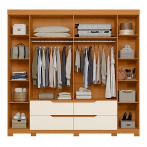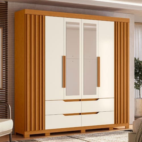 O Guarda-Roupa Doble Casal é perfeito para quem quer sofisticação e organização. As portas laterais com acabamento ripado dão charme. Com 4 gavetas e puxadores cavados com corrediças telescópicas, é fácil de guardar. As portas com puxadores de MDF revestidos são elegantes. As cabideiras de alumínio ajudam a guardar suas roupas. 10 pés para ficar mais estável e durar mais tempo. Transforme seu espaço em útil e bonito.