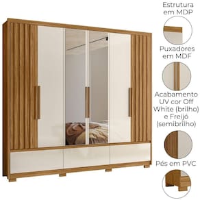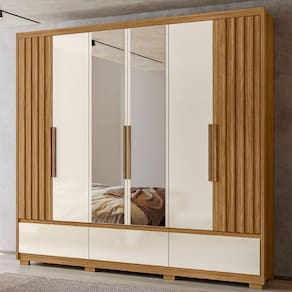 Desenvolvido para facilitar sua rotina, o Guarda-Roupa Casal Amazonas traz design funcional e amplo espaço interno. Estrutura em MDP (15/12 mm) e acabamento em pintura UV. Composto por portas com dobradiças metálicas e tripla opção de montagem (permitindo escolher a posição das portas com ripados em MDF e com espelho, seja na lateral ou ao centro), prateleiras internas, cabideiro interno em alumínio e gavetas com corrediças telescópicas. Produto com dupla opção de montagem: pés em PVC ou sapatas plásticas (2 mm) conforme preferência do cliente. Este produto será entregue em 05 volumes.