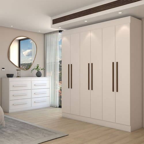 O(a) Guarda-Roupa Casal Europa 6 Portas 2 Gavetas e Cômoda 6 Gavetas 100% Mdf Branco - Loja é produzido em 100% MDF na escala de brilho Semi-Brilho, e possui um grau de dificuldade de montagem: Médio.