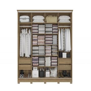Dimensões: Altura: 234 cm Largura: 265 cm Profundidade: 58 cm Peso: 223,68 kg Materiais e Estrutura: Produzido em MDP 15mm 4 portas de correr 4 gavetas com corrediças telescópicas 2 cabideiros metálicos Espelho corpo inteiro Pés em polipropileno Portas com tonalidades flex, escolher no ato da montagem