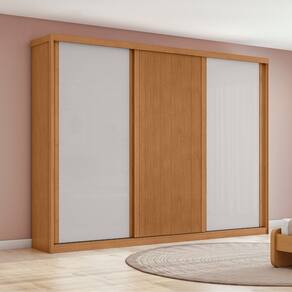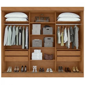 Características: 2 Cabideiros 4 Gavetas 3 Portas sendo uma ripada Corrediças telescópicas Costas inteiriças Espaço para sapatos e roupas longas Estrutura em MDF 6 Prateleiras Molduras arredondadas Molduras laterais em MDF Portas deslizantes e dupla-face Trilho em alumínio roldanas reguláveis molas
