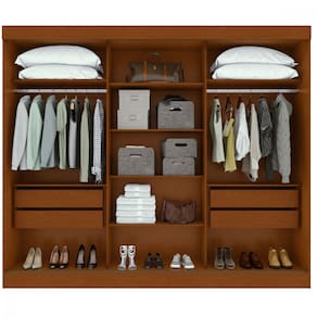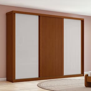 Características: 2 Cabideiros 4 Gavetas 3 Portas sendo uma ripada Corrediças telescópicas Costas inteiriças Espaço para sapatos e roupas longas Estrutura em MDF 6 Prateleiras Molduras arredondadas Molduras laterais em MDF Portas deslizantes e dupla-face Trilho em alumínio roldanas reguláveis molas
