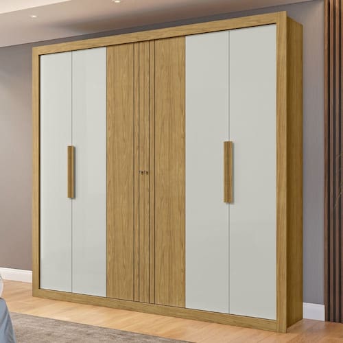 Guarda Roupa Casal Frisado 6 Portas Montecarlo Vis?o M?veis. Com uma divis?o interna inteligente, ele otimiza o espa?o interno, garantindo funcionalidade. O revestimento em pintura UV texturizada impermeabiliza as pe?as, oferecendo maior durabilidade. As portas com acabamentos usinados trazem personalidade ao seu quarto, enquanto as portas pivotantes permitem a abertura total do m?vel, facilitando a visualiza??o de todos os compartimentos e promovendo uma organiza??o mais eficiente dos seus itens.