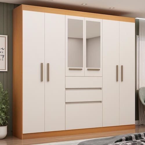 Quer dar aquele up no seu quarto com um móvel bonito, espaçoso e super funcional? Então você vai adorar o Guarda Roupa Casal Genialflex Berna Com Espelhos! Ele tem 7 portas, 2 gavetas e um espaço interno super bem dividido pra deixar tudo no seu lugar ? roupas, sapatos, acessórios? tudo mesmo! Ah, e o detalhe que faz toda a diferença: são 2 espelhos nas portas, que além de facilitarem na hora de se arrumar, ainda ampliam a sensação de espaço e deixam o ambiente mais sofisticado. E o melhor: o visual é um charme só, com a combinação do branco brilho laca com o Freijó que traz um toque moderno e acolhedor pro ambiente. É o tipo de móvel que facilita a rotina e ainda deixa o quarto muito mais aconchegante. Uma escolha prática e cheia de estilo!
