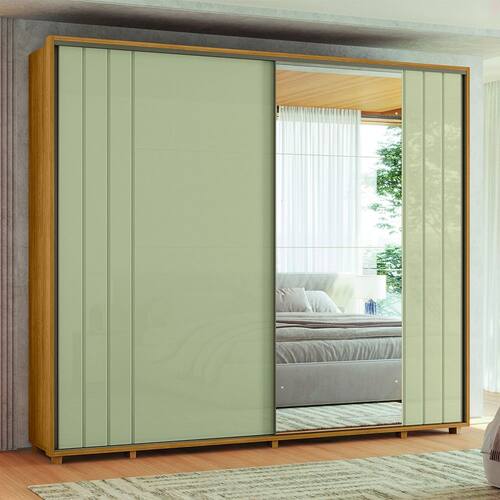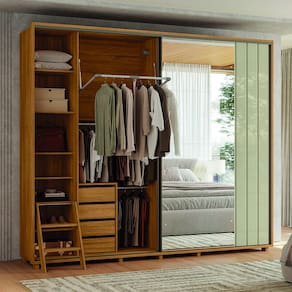 CARACTERÍSTICAS TÉCNICAS: - Produzido todo em MDF - Moldura em MDF de 25mm - Acabamento em pintura UV fosco/brilho - Espelhos em 1 das portas - 8 gavetas com corrediça telescópica - 2 portas de correr com sistema de amortecimento - 2 escadas retrátil em MDF - 6 cabideiros em alumínio, sendo os 2 superiores extensíveis - Puxadores em Alumínio - 14 nichos