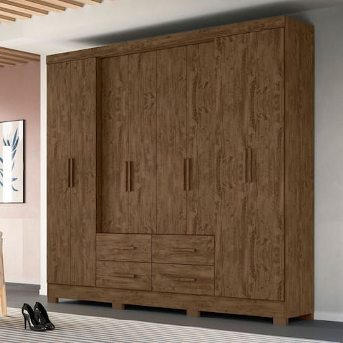 Espaçoso e com linhas retas que trazem modernidade, o Guarda Roupa San Lorenzo é feito em MDP de alta qualidade. Conta com 8 portas de bater e 4 gavetas externas com corrediças telescópicas que conferem uma abertura ampla e fechamento suave. Com puxadores em MDF, dobradiças metálicas e cabideiros em alumínio, ele confere resistência e durabilidade nos componentes. As portas centrais recuadas conferem um design moderno e sofisticado.   CARACTERÍSTICAS TÉCNICAS: - Produzido em MDP; - Cabideiros em Alumínio; - Portas Centrais Recuadas; - 8 Portas de Giro com Dobradiças Metálicas; - 4 Gavetas com Corrediças Telescópicas; - Puxadores em MDF.   INFORMAÇÕES TÉCNICAS: Altura: 222 cm Largura: 237 cm Profundidade: 47 cm Peso: 141,26 kg   INFORMAÇÕES ADICIONAIS: - Não realizamos a montagem do móvel e não nos responsabilizamos por ela. Verifique o produto antes de montá-lo. Produtos danificados na montagem não serão trocados. Montagem e instalação são por conta do comprador. - As imagens decorativas são ilustrativas e podem conter itens não inclusos. As cores do produto podem variar conforme o monitor, iluminação ou percepção visual. - Limpeza: Use um pano macio seco ou levemente umedecido com água. Não utilize materiais abrasivos como palha de aço ou objetos cortantes. - Garantia de 3 meses contra defeitos de fabricação conforme o Código de Defesa do Consumidor.