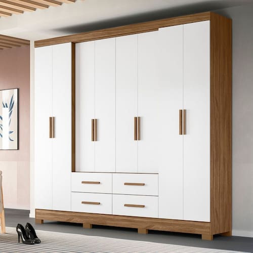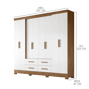 Espaçoso e com linhas retas que trazem modernidade, o Guarda Roupa San Lorenzo é feito em MDP de alta qualidade. Conta com 8 portas de bater e 4 gavetas externas com corrediças telescópicas que conferem uma abertura ampla e fechamento suave. Com puxadores em MDF, dobradiças metálicas e cabideiros em alumínio, ele confere resistência e durabilidade nos componentes. As portas centrais recuadas conferem um design moderno e sofisticado. CARACTERÍSTICAS TÉCNICAS: - Produzido em MDP; - Cabideiros em Alumínio; - Portas Centrais Recuadas; - 8 Portas de Giro com Dobradiças Metálicas; - 4 Gavetas com Corrediças Telescópicas; - Puxadores em MDF. INFORMAÇÕES TÉCNICAS: Altura: 222 cm Largura: 237 cm Profundidade: 47 cm Peso: 141,26 kg INFORMAÇÕES ADICIONAIS: - Não realizamos a montagem do móvel e não nos responsabilizamos por ela. Verifique o produto antes de montá-lo. Produtos danificados na montagem não serão trocados. Montagem e instalação são por conta do comprador. - As imagens decorativas são ilustrativas e podem conter itens não inclusos. As cores do produto podem variar conforme o monitor, iluminação ou percepção visual. - Limpeza: Use um pano macio seco ou levemente umedecido com água. Não utilize materiais abrasivos como palha de aço ou objetos cortantes. - Garantia de 3 meses contra defeitos de fabricação conforme o Código de Defesa do Consumidor.