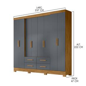 Espaçoso e com linhas retas que trazem modernidade, o Guarda Roupa San Lorenzo é feito em MDP de alta qualidade. Conta com 8 portas de bater e 4 gavetas externas com corrediças telescópicas que conferem uma abertura ampla e fechamento suave. Com puxadores em MDF, dobradiças metálicas e cabideiros em alumínio, ele confere resistência e durabilidade nos componentes. As portas centrais recuadas conferem um design moderno e sofisticado. CARACTERÍSTICAS TÉCNICAS: - Produzido em MDP; - Cabideiros em Alumínio; - Portas Centrais Recuadas; - 8 Portas de Giro com Dobradiças Metálicas; - 4 Gavetas com Corrediças Telescópicas; - Puxadores em MDF. INFORMAÇÕES TÉCNICAS: Altura: 222 cm Largura: 237 cm Profundidade: 47 cm Peso: 141,26 kg INFORMAÇÕES ADICIONAIS: - Não realizamos a montagem do móvel e não nos responsabilizamos por ela. Verifique o produto antes de montá-lo. Produtos danificados na montagem não serão trocados. Montagem e instalação são por conta do comprador. - As imagens decorativas são ilustrativas e podem conter itens não inclusos. As cores do produto podem variar conforme o monitor, iluminação ou percepção visual. - Limpeza: Use um pano macio seco ou levemente umedecido com água. Não utilize materiais abrasivos como palha de aço ou objetos cortantes. - Garantia de 3 meses contra defeitos de fabricação conforme o Código de Defesa do Consumidor.