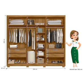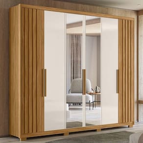 O Guarda-Roupa Araguaia é uma opção que combina bom gosto, qualidade e praticidade. Possui 6 portas, das quais 2 são com ripado em MDF, permitindo um design personalizável com 3 diferentes opções de montagem, além de 2 amplos espelhos. Com divisória ele/ela, inclui 3 cabideiros, sendo um específico para roupas longas, e 4 gavetas com corrediças telescópicas, que garantem uma abertura ampla e fácil acesso, além de vários nichos que permitem uma organização cuidadosa e eficiente dos pertences.