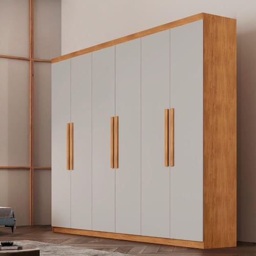 O Guarda-Roupa Hera e sinonimo de praticidade e elegancia. Produzido em 100 MDF, ele oferece um design minimalista com um toque de requinte que se destaca em qualquer ambiente. Com 6 portas, 2 gavetas e 3 cabideiros, sua ampla e bem planejada divisao interna proporciona o espaco ideal para guardar seus pertences com organizacao e eficiencia. Alem de facilitar a sua rotina, o Hera traz harmonia e sofisticacao ao seu lar, tornando-o um aliado perfeito para quem valoriza um estilo de vida organizado e estiloso.