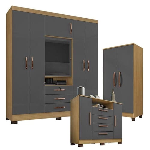 Guarda Roupa Casal Imperial com Armário Multiuso Recife e Cômoda Madri Carvalho Americano Grafite - Incorplac