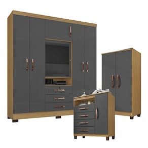 Guarda Roupa Casal Imperial com Armário Multiuso Recife e Cômoda Sapateira Cannes Carvalho Americano Grafite - Incorplac