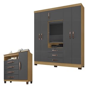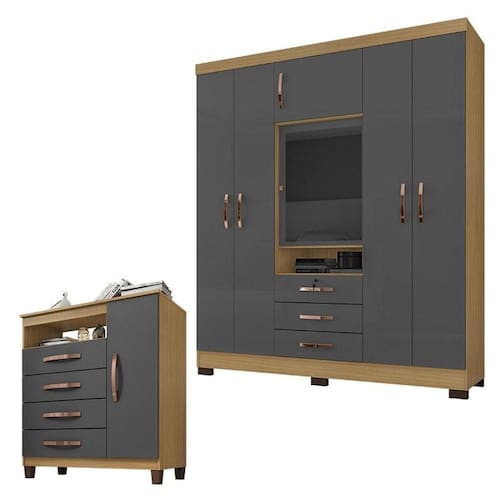 Guarda Roupa Casal Imperial com Cômoda Sapateira Cannes Carvalho Americano Grafite Incorplac