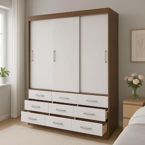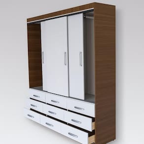 Composto por 3 portas de abrir e 9 gavetas, este guarda-roupa permite a acomodação de diferentes tipos de roupas e itens. As gavetas são perfeitas para guardar peças íntimas, camisetas e outros itens dobrados, enquanto as prateleiras internas oferecem espaço para roupas maiores, como calças e casacos. As portas, com acabamento em laca fosca, abrem espaço para cabideiros, onde é possível pendurar peças que precisam ser mantidas esticadas, como vestidos, camisas e blazers.