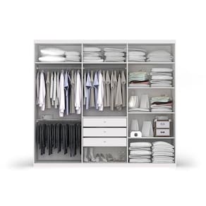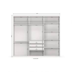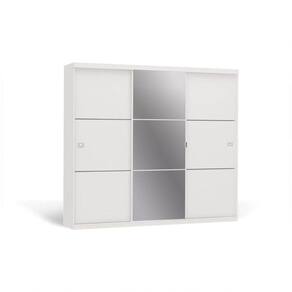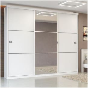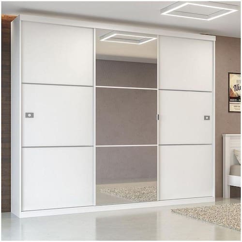 Cabideiro: Metálicos | Cor: Branco | Corrediças: Metálicas | Garantia: 3 meses para defeito de fabricação | Gavetas: Internas | Maleiro: Sim | Matéria-prima: MDP | Peso suportado por cada prateleira: 7 kg | Peso suportado por gaveta: 6 kg | Puxadores: Metálicos e de Polipropileno | Quantidade de calceiros: 1 | Quantidade de espelhos: 3 | Quantidade de gavetas: 3 | Quantidade de portas: 3 | Quantidade de prateleiras: 5 | Sistema de montagem: Parafuso Philips e Minifix | Tipo de porta: Correr
