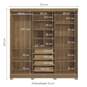 Produzido em MDP, material de alta qualidade, com chapa de 15mm, ele conta com três portas de correr e o tamanho ideal para todos os ambientes, com 2,23m de altura, 2,13m de largura e 53cm de profundidade. E são sete camadas de pintura, tanto na parte interna quanto na externa, o que garante mais durabilidade e beleza ao seu móvel.