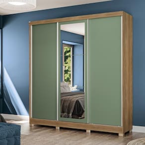 E para completar o charme do guarda-roupa, ele conta com corpo na cor nogueira, com pintura touch, que traz a textura dos veios da madeira, enquanto suas portas são reversíveis, possibilitando escolher entre as cores verde oliva, com pintura fosca, ou nogueira, com acabamento touch, garantindo muita beleza para seu espaço. E com espelho de corpo inteiro e pés em polipropileno, esse modelo será o destaque do seu espaço, proporcionando beleza e praticidade ao seu dia a dia.