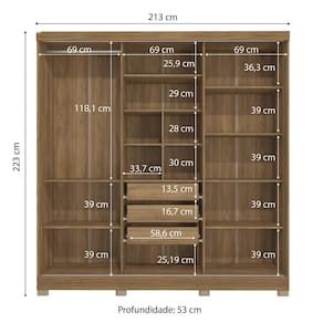 Produzido em MDP, material de alta qualidade, com chapa de 15mm, ele conta com três portas de correr e o tamanho ideal para todos os ambientes, com 2,23m de altura, 2,13m de largura e 53cm de profundidade. E são sete camadas de pintura, tanto na parte interna quanto na externa, o que garante mais durabilidade e beleza ao seu móvel.