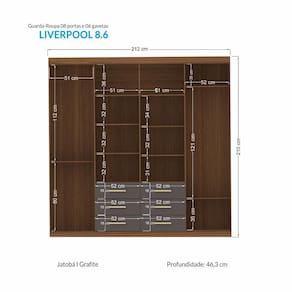 O Guarda-Roupa Liverpool é um móvel prático e funcional, e se encaixa em qualquer ambiente do quarto de casal ou solteiro. Com 8 portas e 6 gavetas, esse roupeiro garante muito espaço para guardar todas as roupas. Puxadores em ABS garantem um design moderno. Internamente, possui amplas prateleiras para guardar todas as roupas de forma organizada, assim como edredons, cobertores, caixas, travesseiros, decoração, etc. Possui 3 cabideiros em alumínio para pendurar todas as roupas (casacos, vestidos, camisas, blusas) com muita organização e segurança. Um guarda-roupa de casal completo e muito prático para o seu quarto.