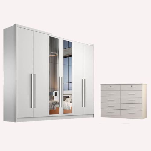 Apresentamos aquela combinação ideal para que seu quarto fique elegante e funcional. Guarda-roupa da linha Livorno e Gaveteiro da linha Milão, fabricados com materiais de altíssima qualidade em MDP/MDF, com um lindo design moderno, o guarda roupa possui várias repartições, gavetas, prateleiras amplo espaço interno garantindo mais organização. O gaveteiro possui 10 gavetas equipadas com corrediças telescópicas garantindo suavidade para manusear. Deixe seu ambiente mais aconchegante, não perca tempo adquira já!