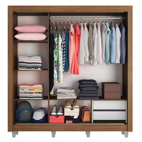 - Itens inclusos: 3 prateleiras totalizando 5 nichos, 2 gavetas internas, 1 cabideiro grande, 3 portas de correr de madeira com 2 puxadores em PVC, 1 Kit com 8 pés em PVC