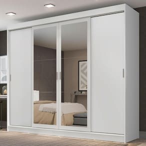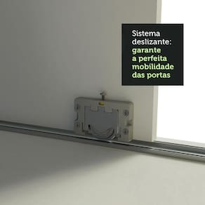 O móvel conta com quatro portas de correr com deslizamento suave, trilhos em alumínio para maior resistência e quatro puxadores externos. Além disso, o sistema anti-descarrilhamento evita com que as portas saiam do trilho e transmitem mais segurança no uso diário. Os espelhos, presentes em duas das portas, são bonitos, muito práticos e úteis.