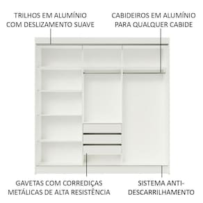 Internamente, são dois cabideiros de alumínio que oferecem espaço para roupas curtas e mais longas, além de diversas prateleiras, nichos e três gavetas espaçosas com corrediças metálicas. Dessa forma, cabe tudo que um casal precisa: calçados, malas, travesseiros, edredons e muito mais.