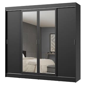 O móvel conta com quatro portas de correr com deslizamento suave, trilhos em alumínio para maior resistência e quatro puxadores externos. Além disso, o sistema anti-descarrilhamento evita com que as portas saiam do trilho e transmitem mais segurança no uso diário. Os espelhos, presentes em duas das portas, são bonitos, muito práticos e úteis.