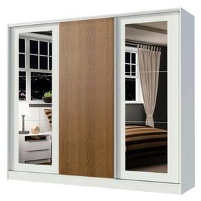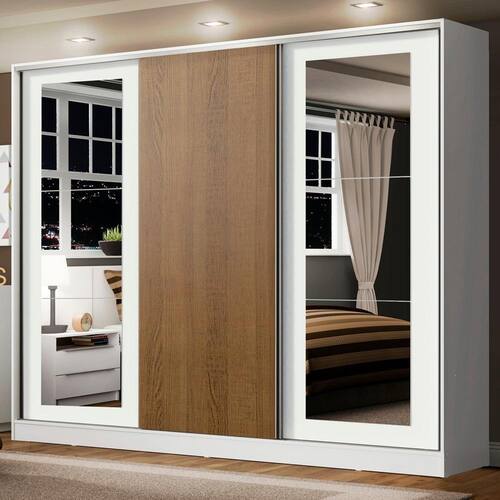 - Três (3) portas de correr, sendo uma (1) de madeira e duas (2) com espelhos, todas apresentando sistema anti-descarrilhamento e puxadores em alumínio em toda a extensão
